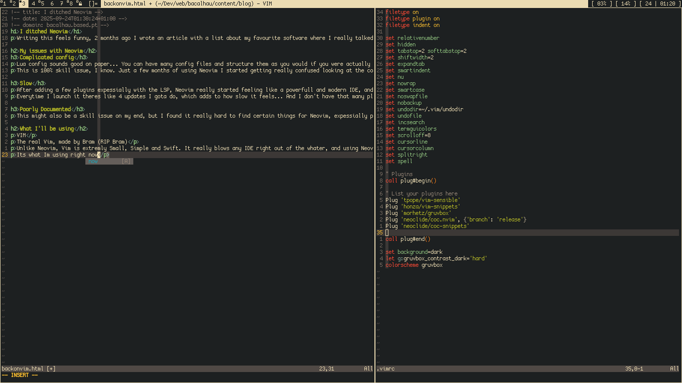 Writing this feels funny, 2 months ago I wrote an article with a list about my favourite software where I really talked about liking Neovim but the truth is, I allways had problems with it. The diference now is that I got fed up with these issues.